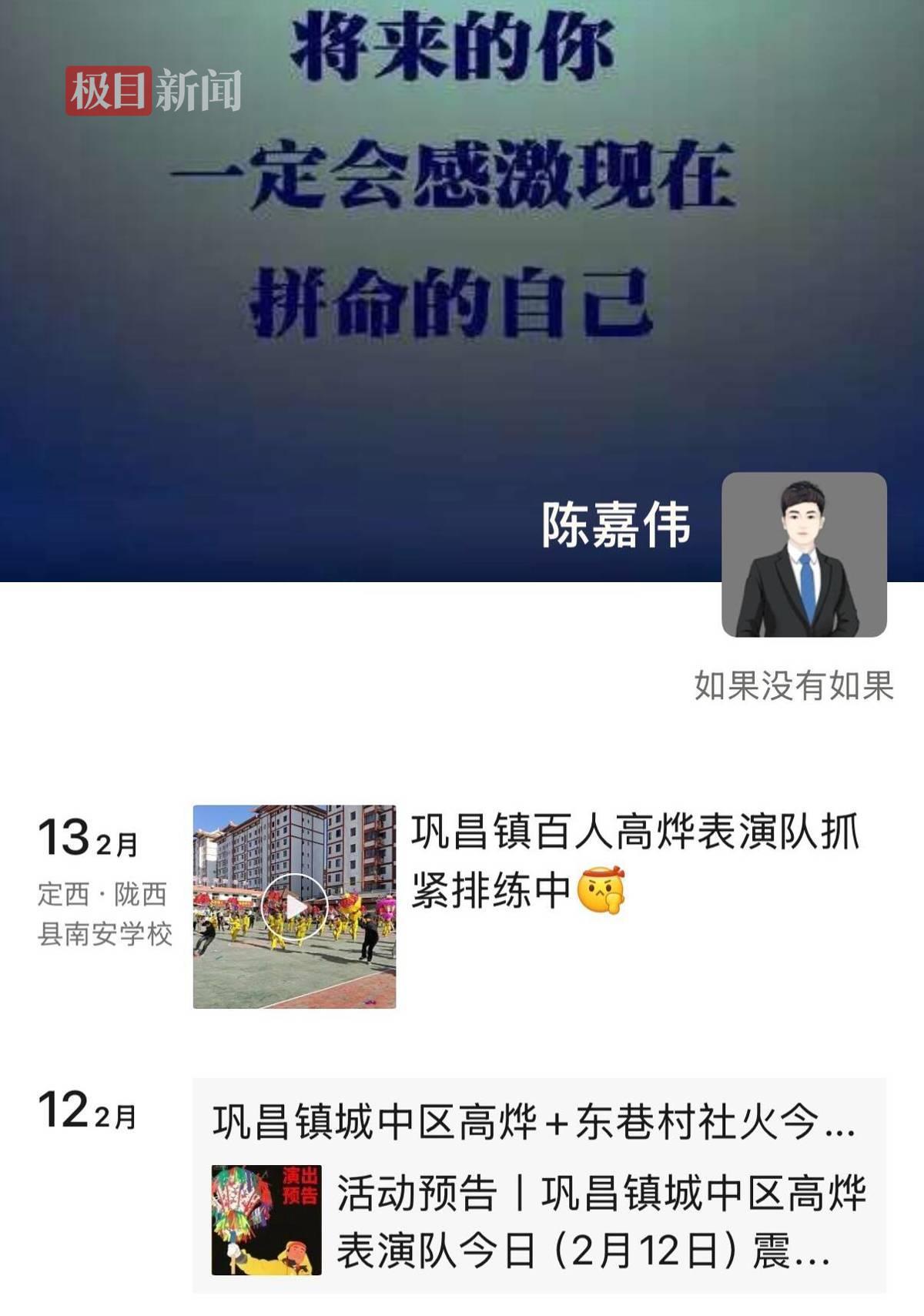 记者注意到,2月13日,陈嘉伟在朋友圈发布了“巩昌镇百人高烨表演队紧急排练”的信息。张明说,这是陈嘉伟生前最后一条动态。